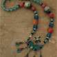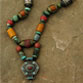 ETHNICPrayer BoxIn cultures like Tibet, the prayer box, or Ghau, is an amulet used to store a sacred prayer or wish. The back of this silver filigree box, decorated with turquoise and coral, comes out so you can store your own treasure inside. In addition, this necklace features two silver and copper Tibetan prayer wheels, two old amazonite beads, two Bakelite “amber” beads, glass, turquoise and carnelian. Spin the prayer wheels clockwise to spread blessings and wishes for well-being and peace. Silver toggle clasp. Contact Nan for details on purchasing this necklace